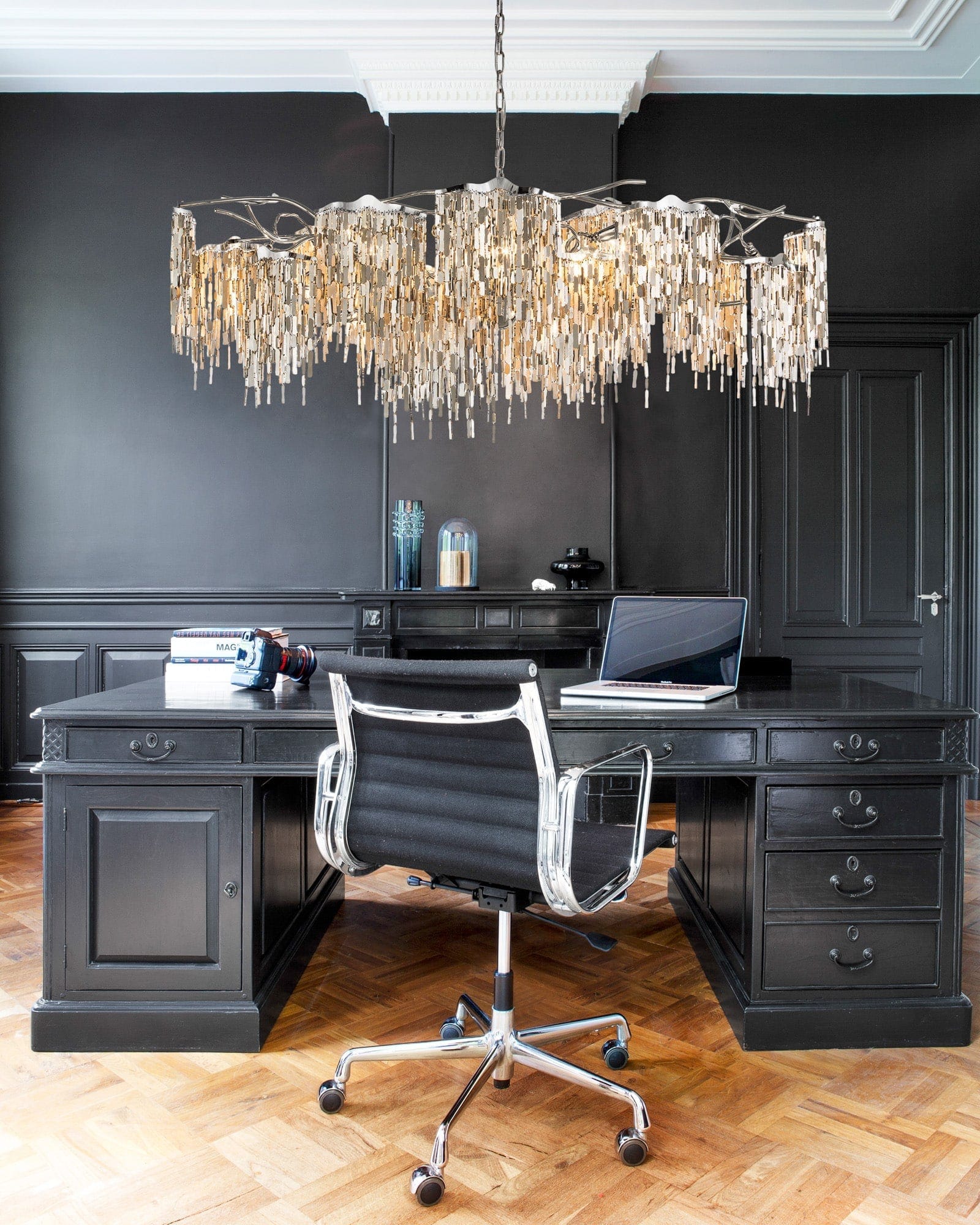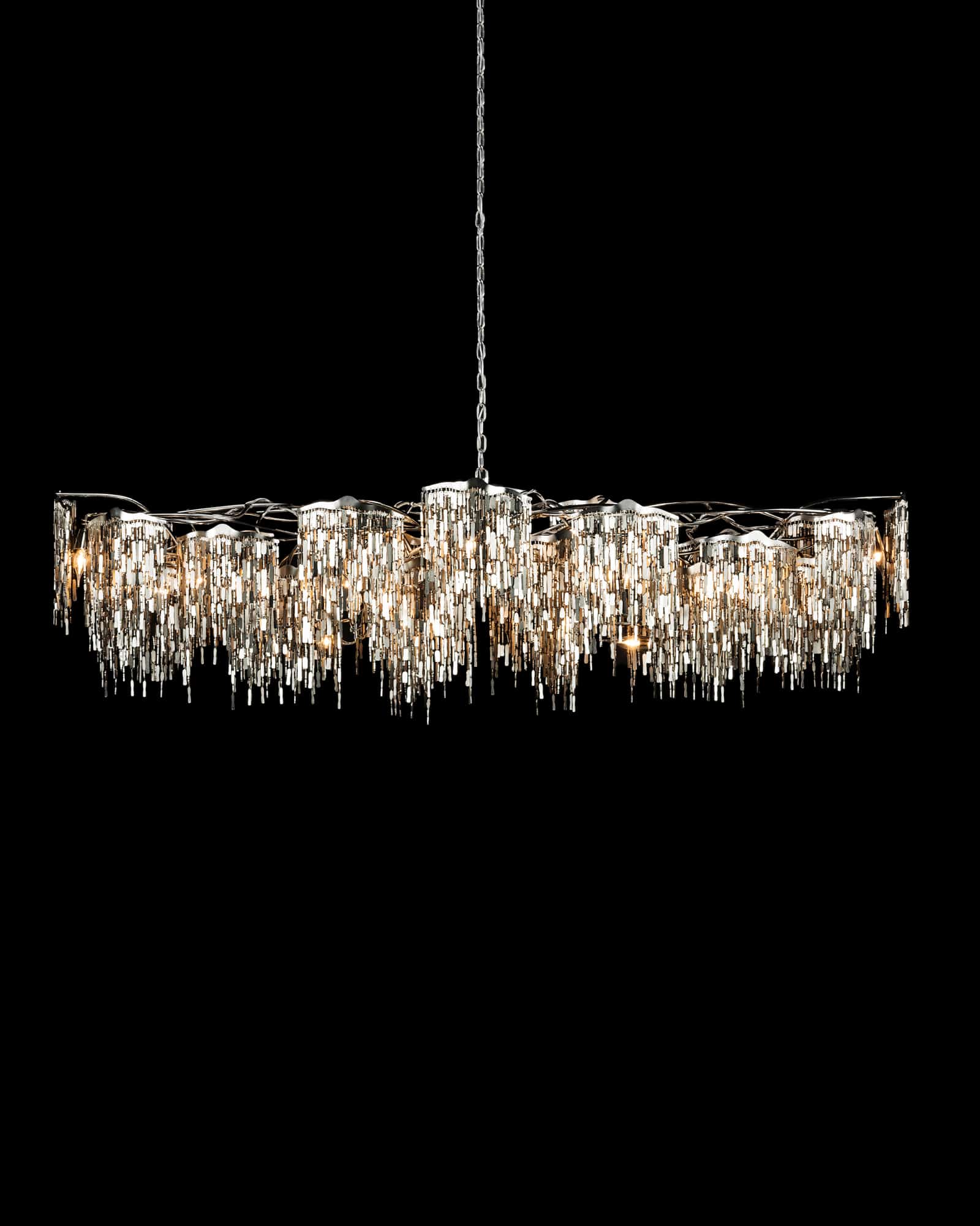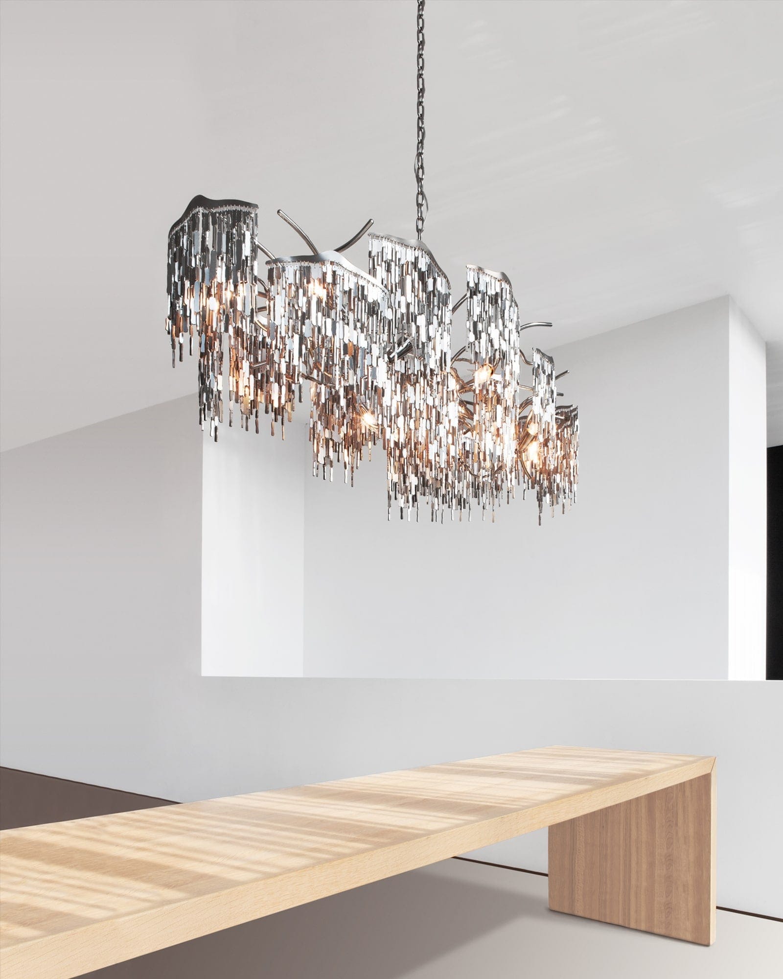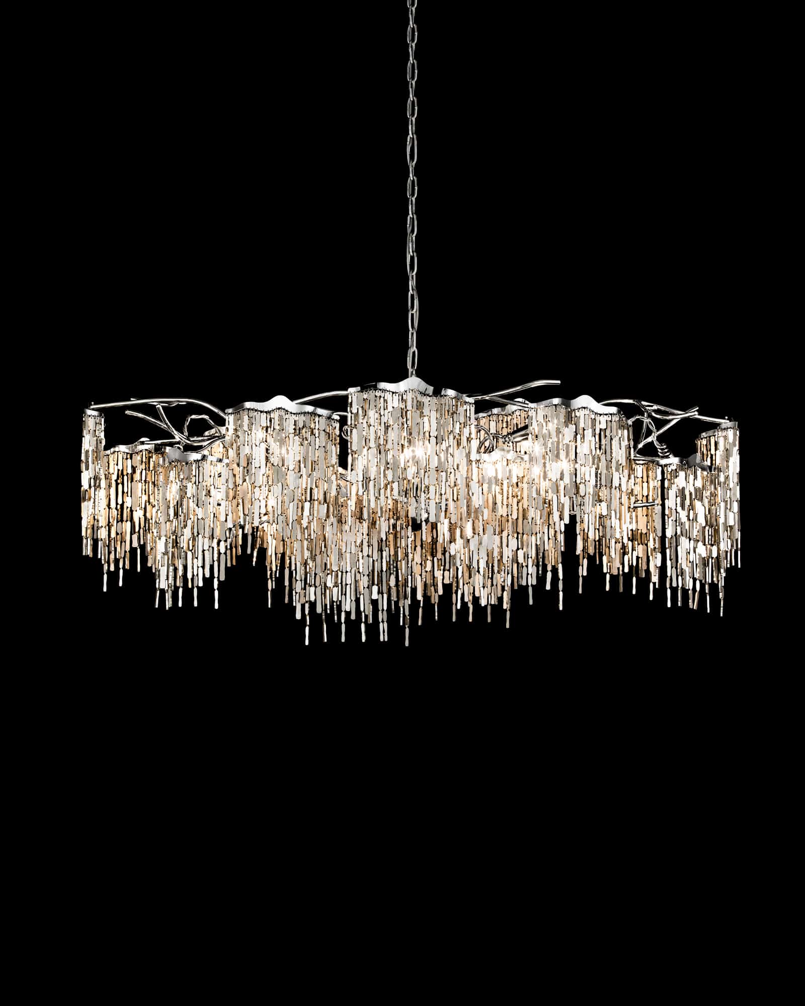 All chandeliers are supplied with a Ø12 cm (4.7 in) diameter dome ceiling cover, Ø16 cm (6.3 in) mounting plate, 170 cm (66.9 in) of chain, and 350 cm (137.8 in) of electrical cable to be woven into the chain. The total drop can be easily adjusted on-site.
