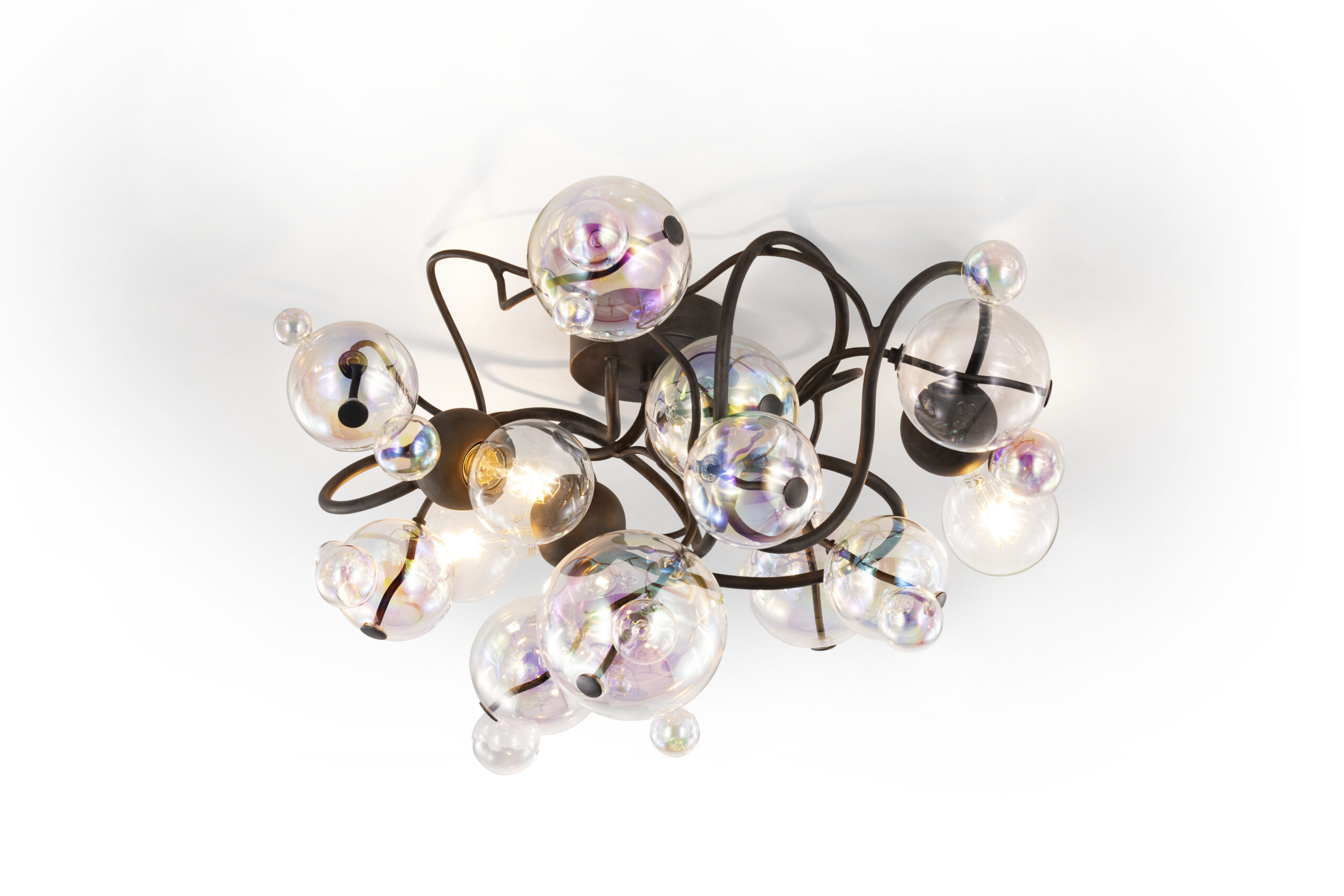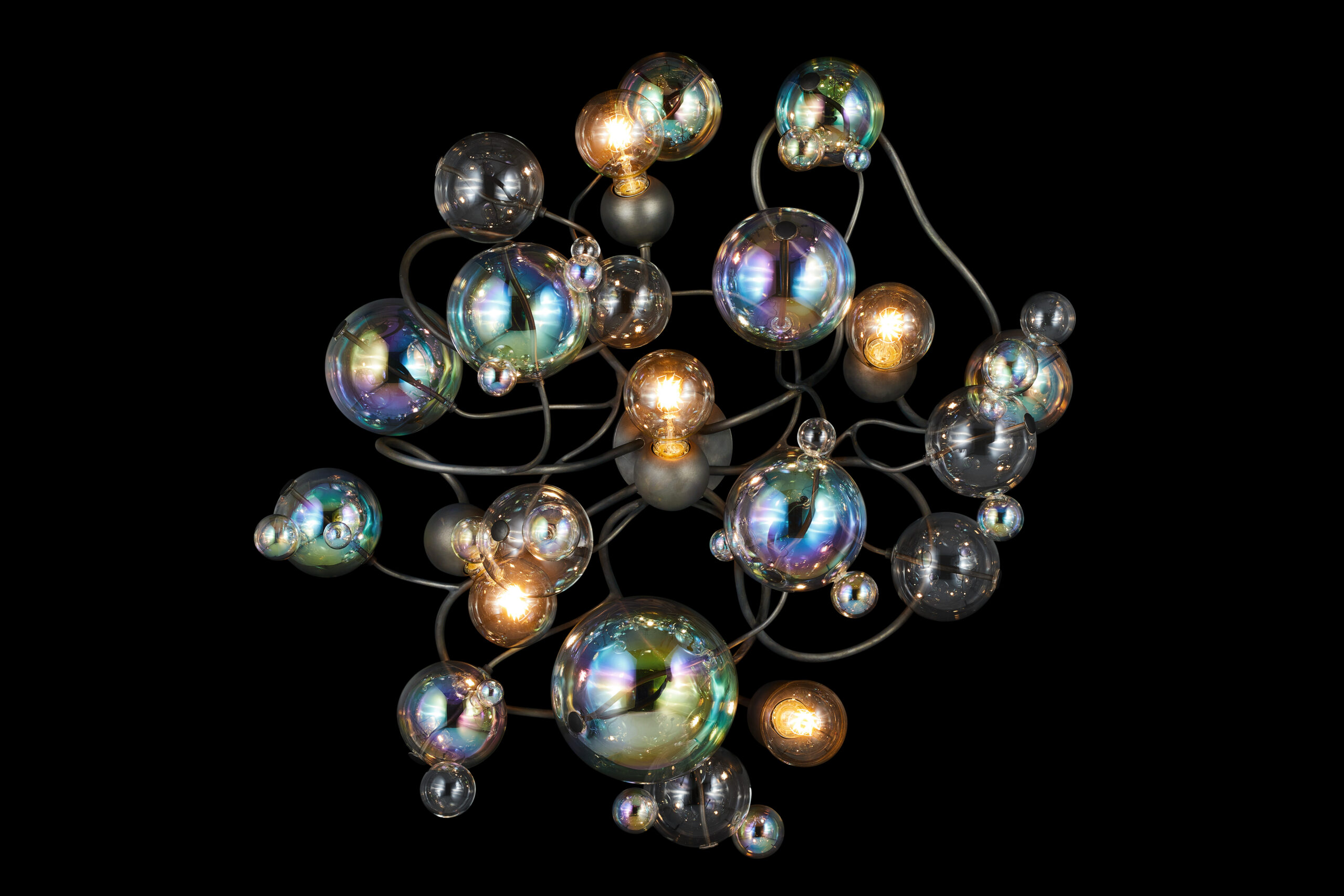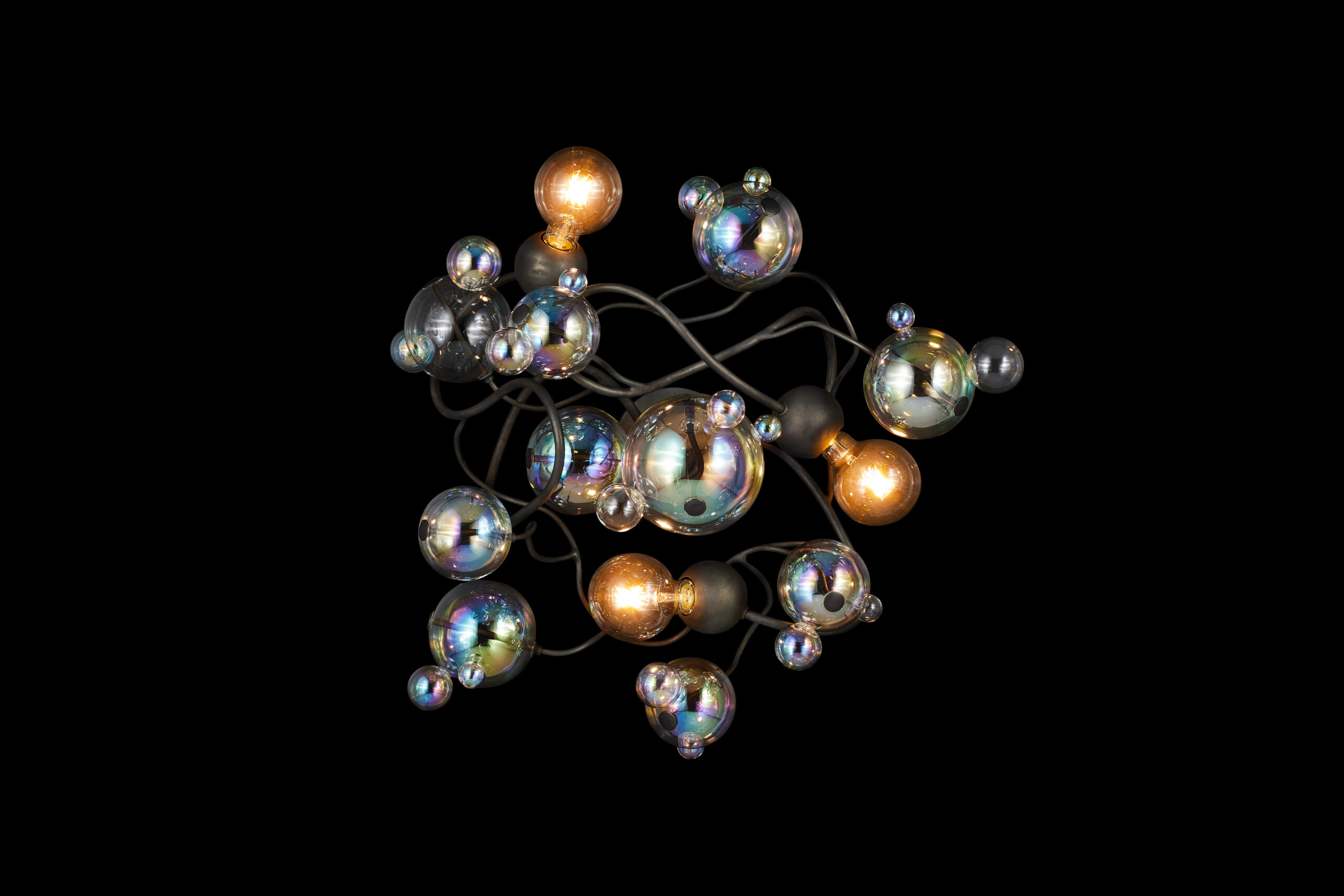 By default, the glass spheres used for the Bubbles Flow collection are predominantly iridescent, mixed with clear. The standard light bulbs are: globe E27-L for 220-240V | E26-L for 110-120V versions.
