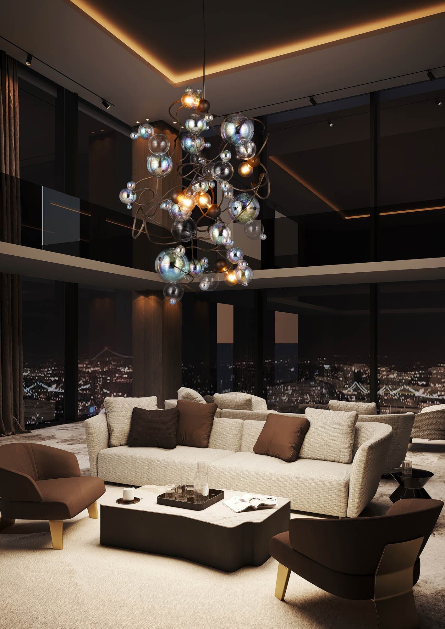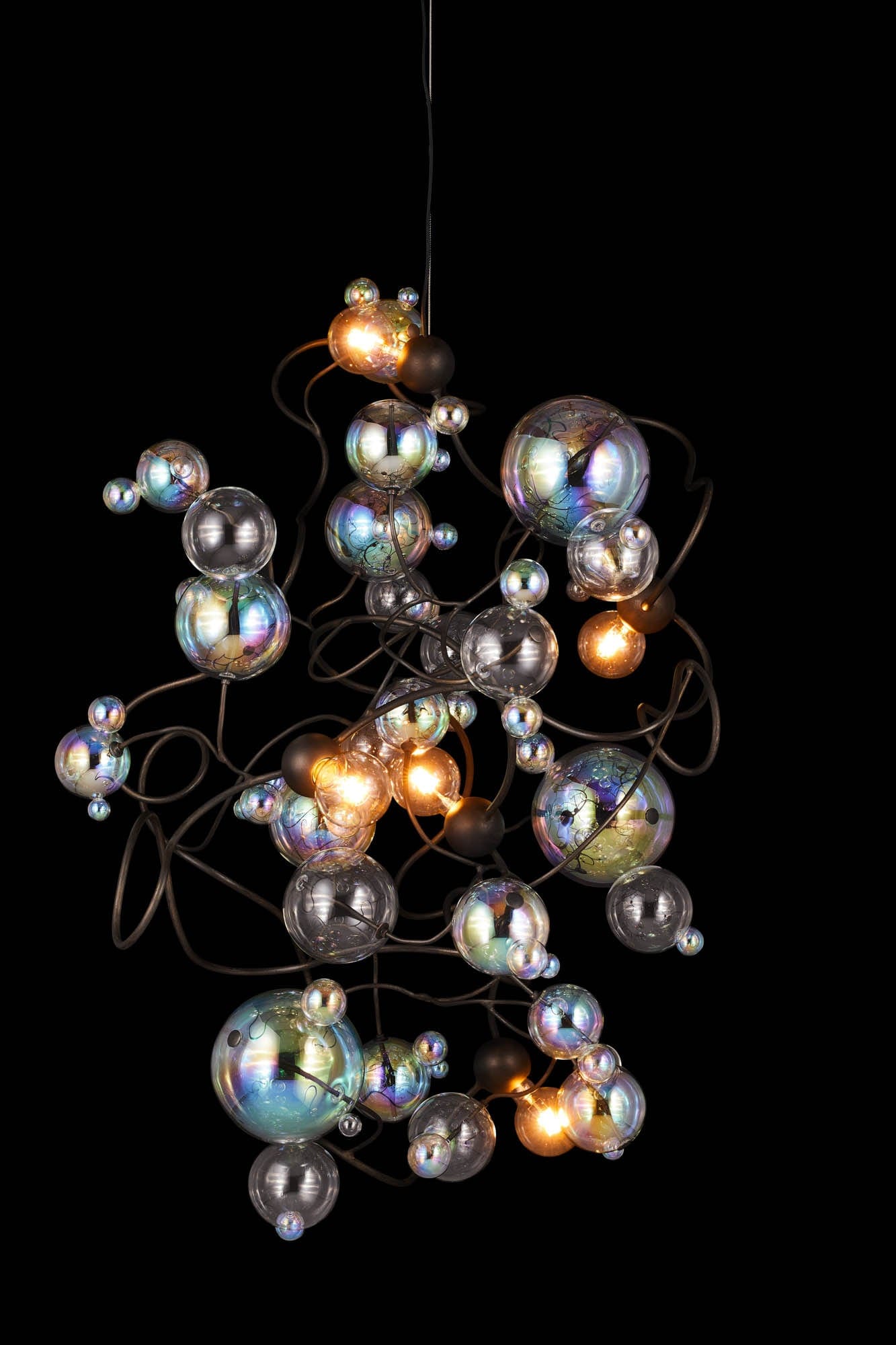 By default, the glass spheres used for the Bubbles Flow collection are predominantly iridescent, mixed with clear. The standard light bulbs are: globe E27-L for 220-240V | E26-L for 110-120V versions.