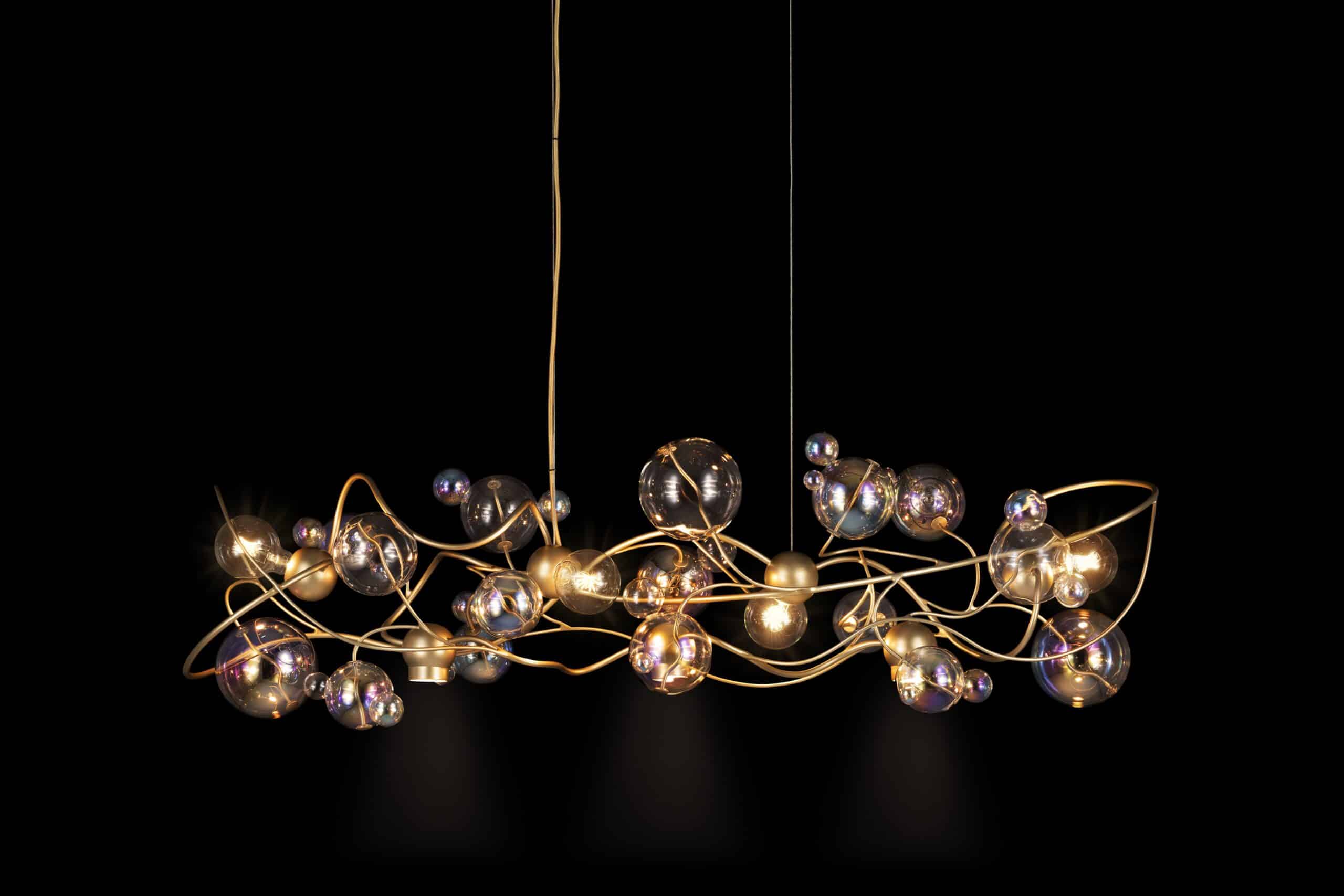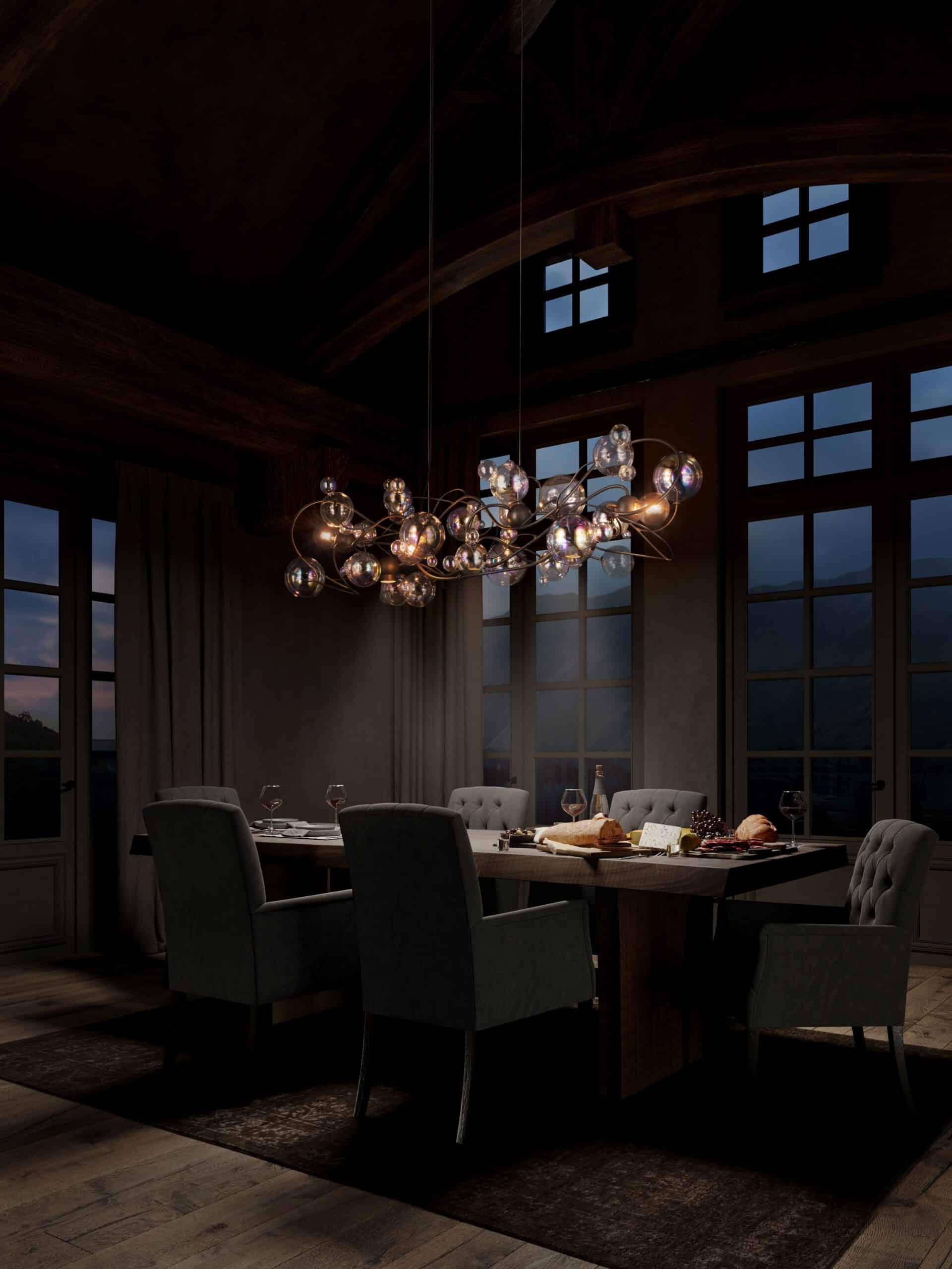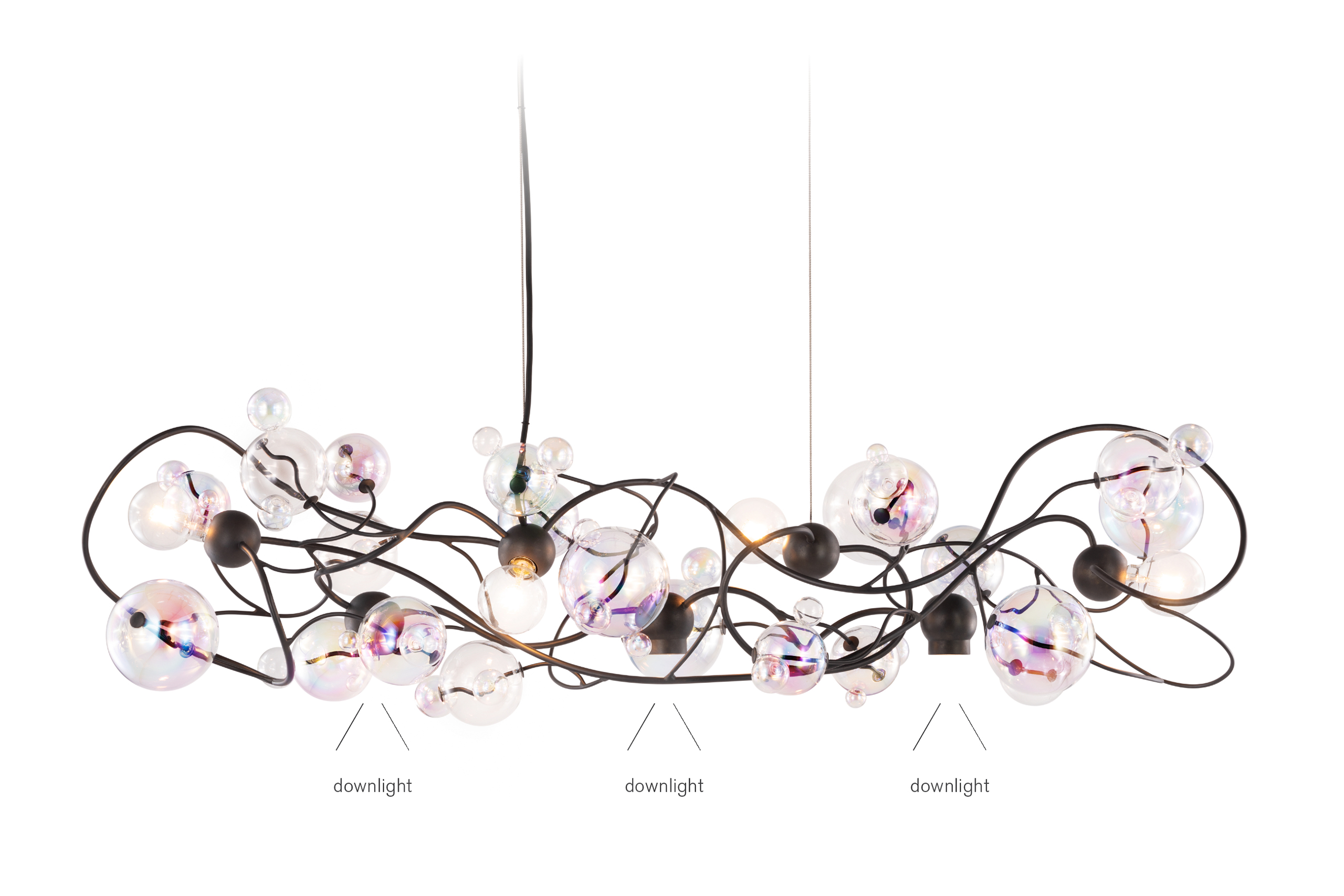 By default, the glass spheres used for the Bubbles Flow collection are predominantly iridescent, mixed with clear. The standard spot downlights are: GU10-A for 220-240V | GU10-A-U for 110-120V versions. The spot downlights are on a separate circuit.