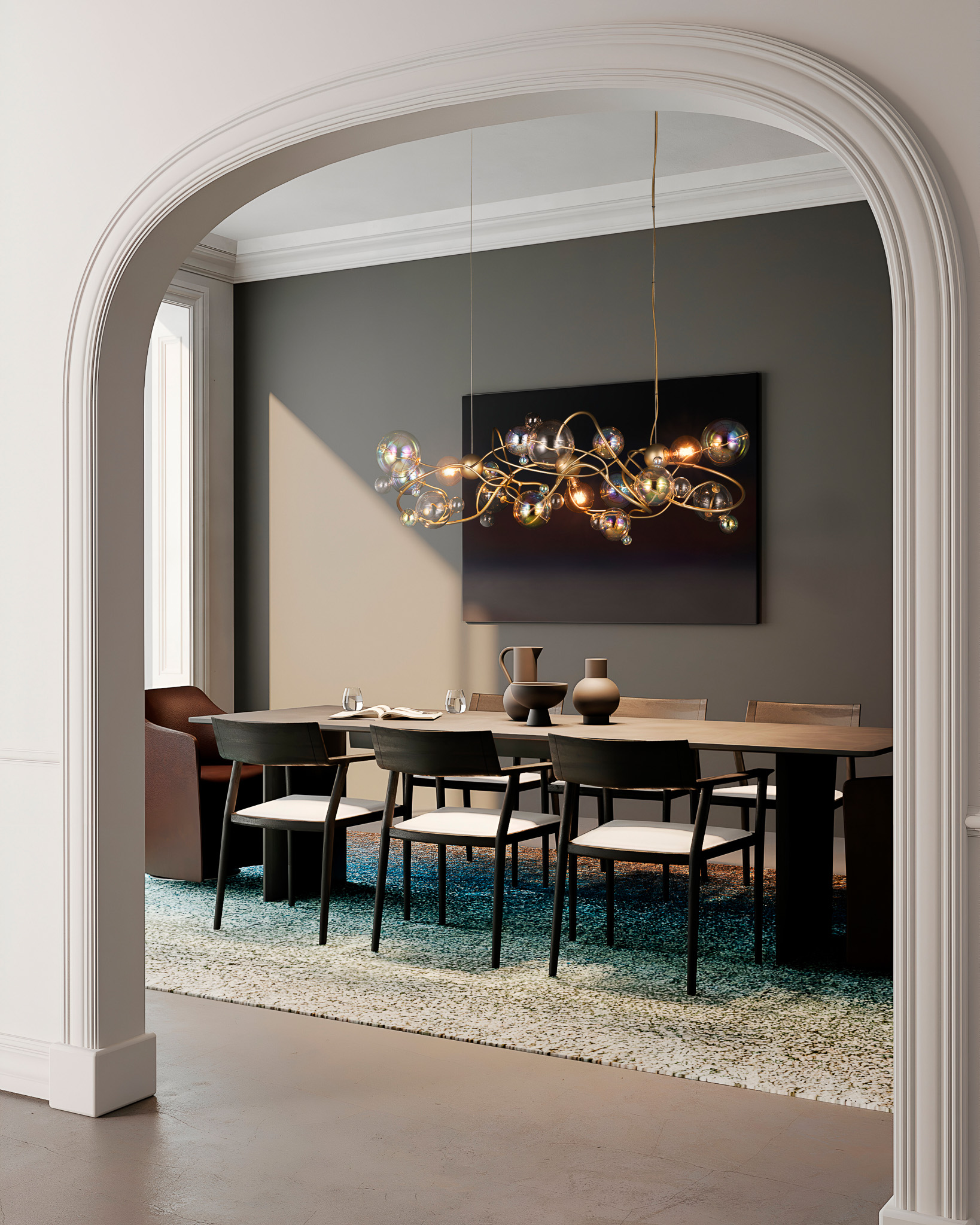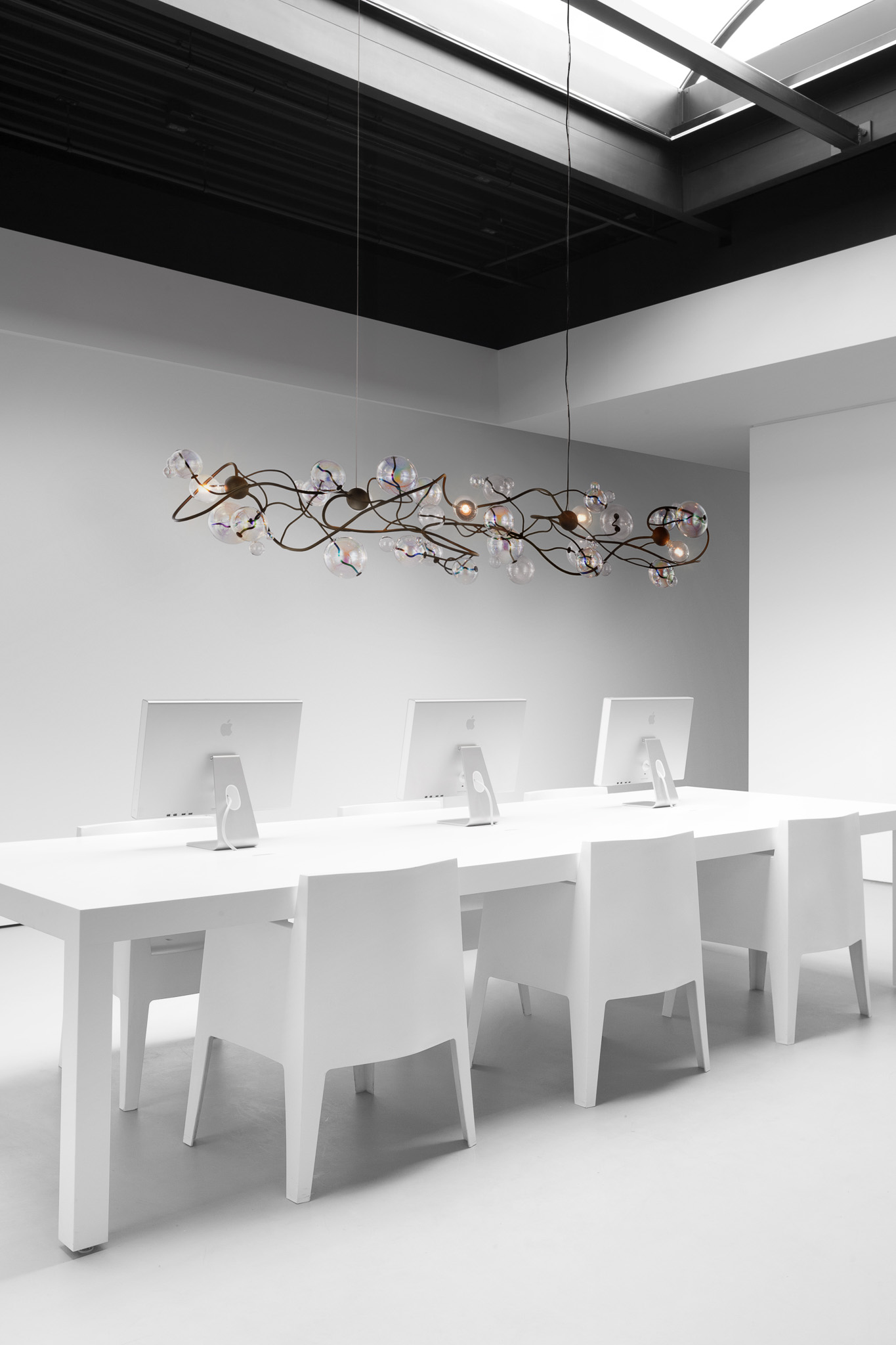By default, the glass spheres used for the Bubbles Flow collection are predominantly iridescent, mixed with clear. The standard light bulbs are: globe E27-L for 220-240V | E26-L for 110-120V versions.