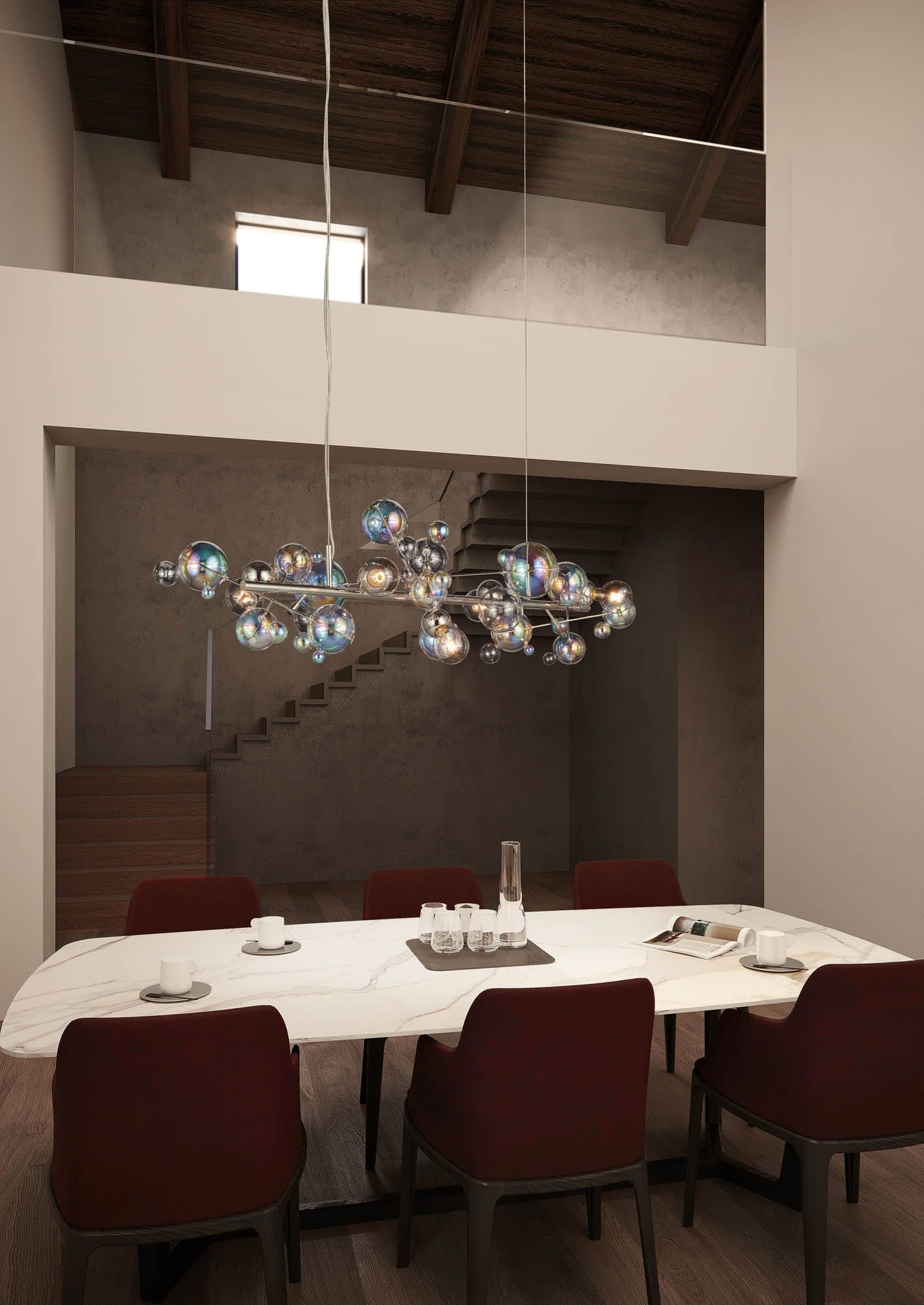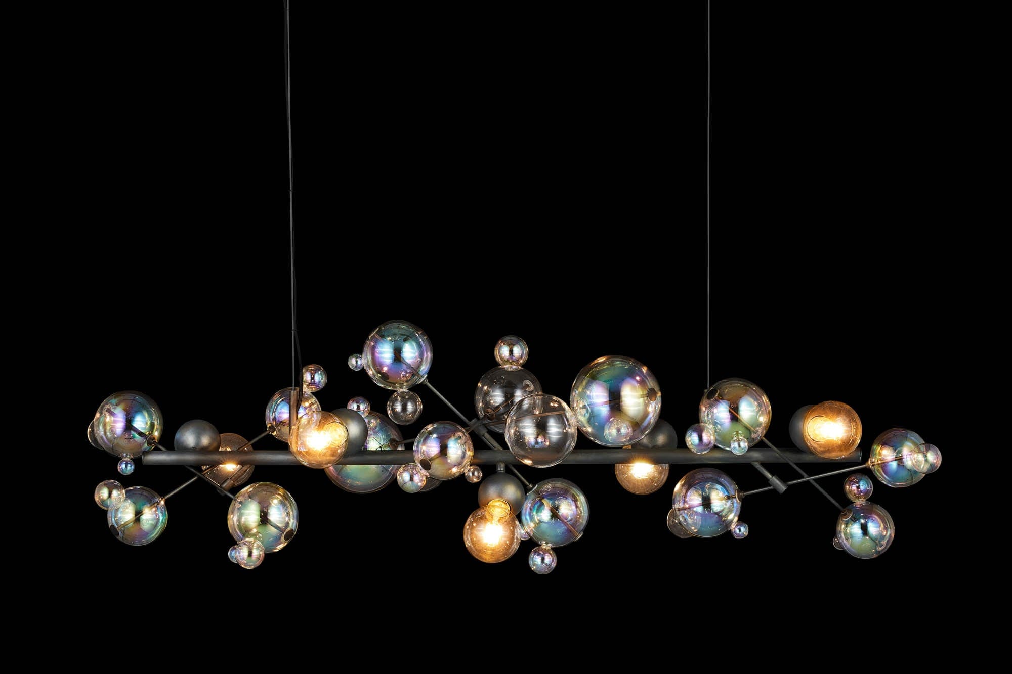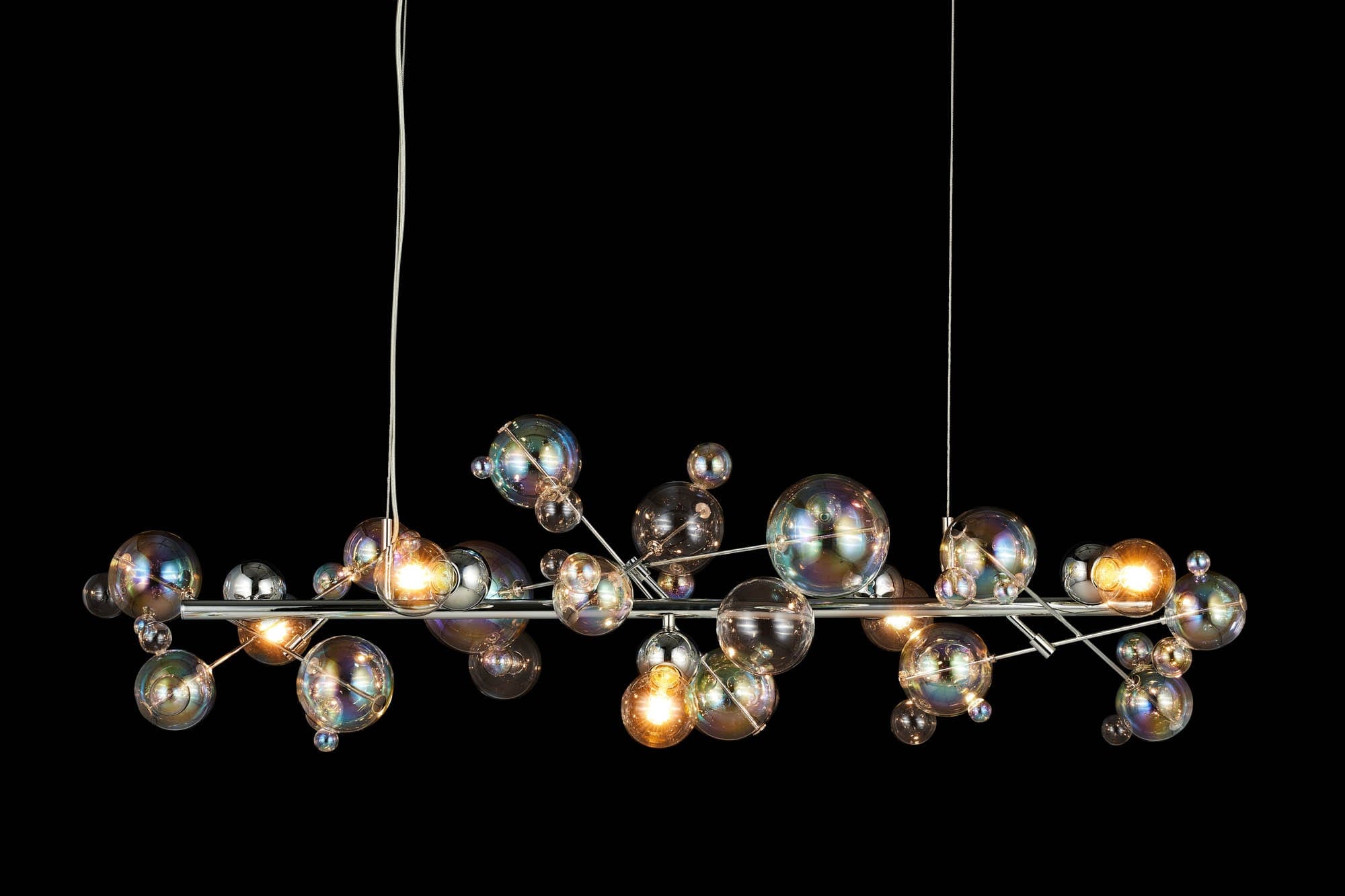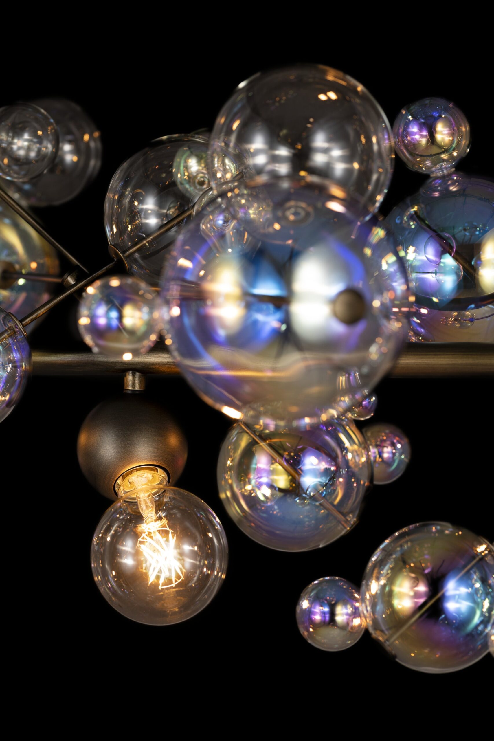 By default, the glass spheres used for the Bubbles collection are predominantly iridescent, mixed with clear. The standard light bulbs are: globe E27-L for 220-240V | E26-L for 110-120V versions.