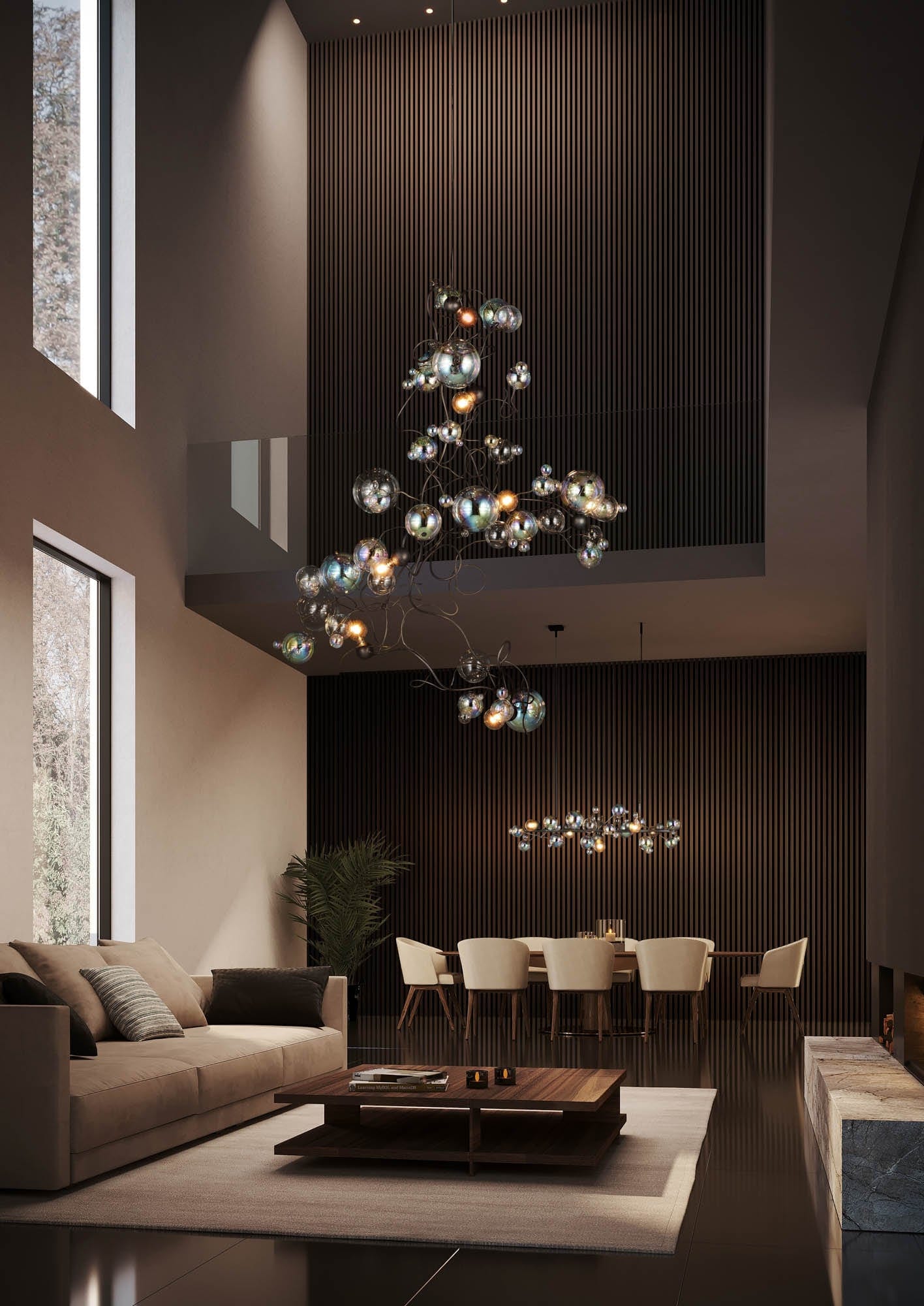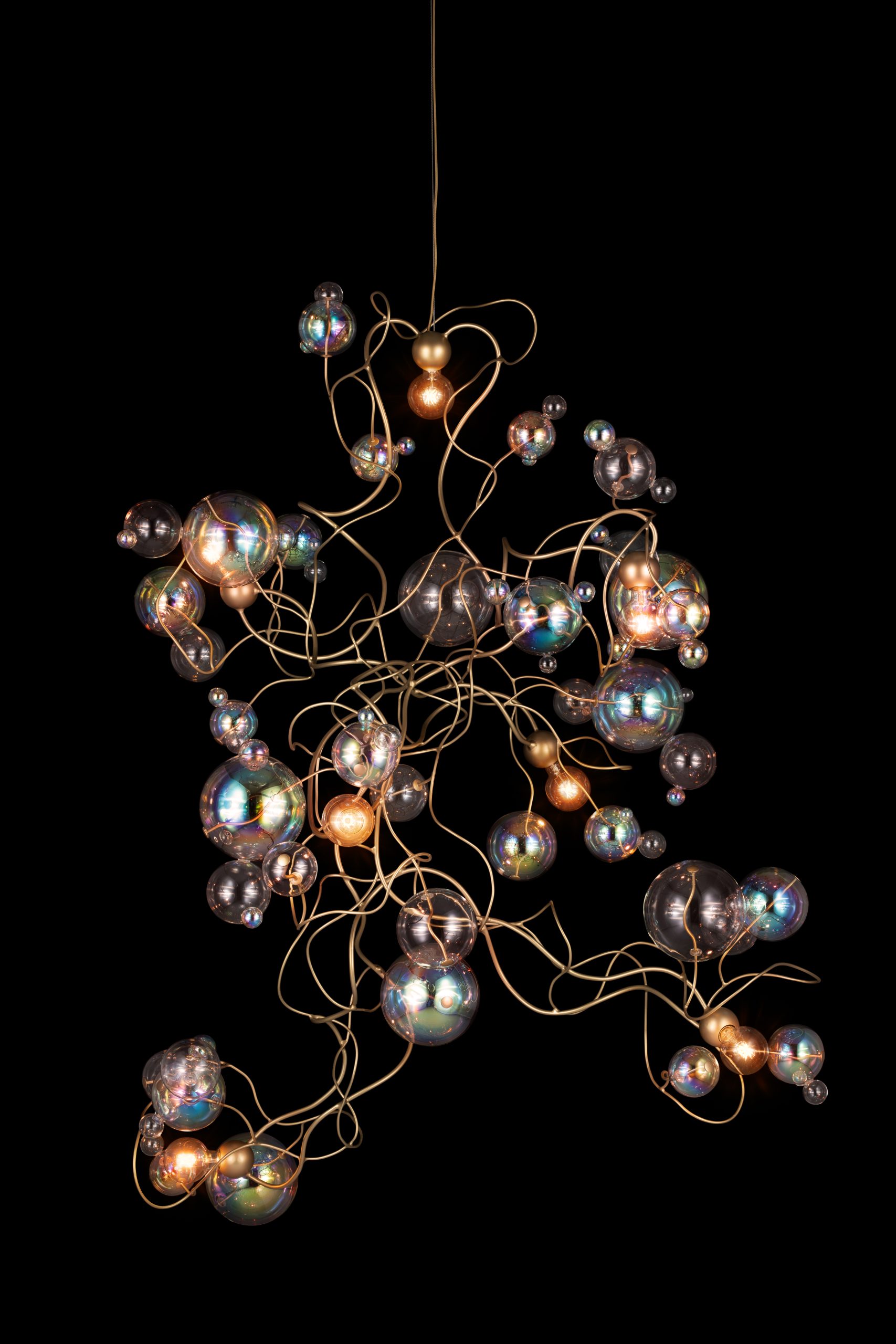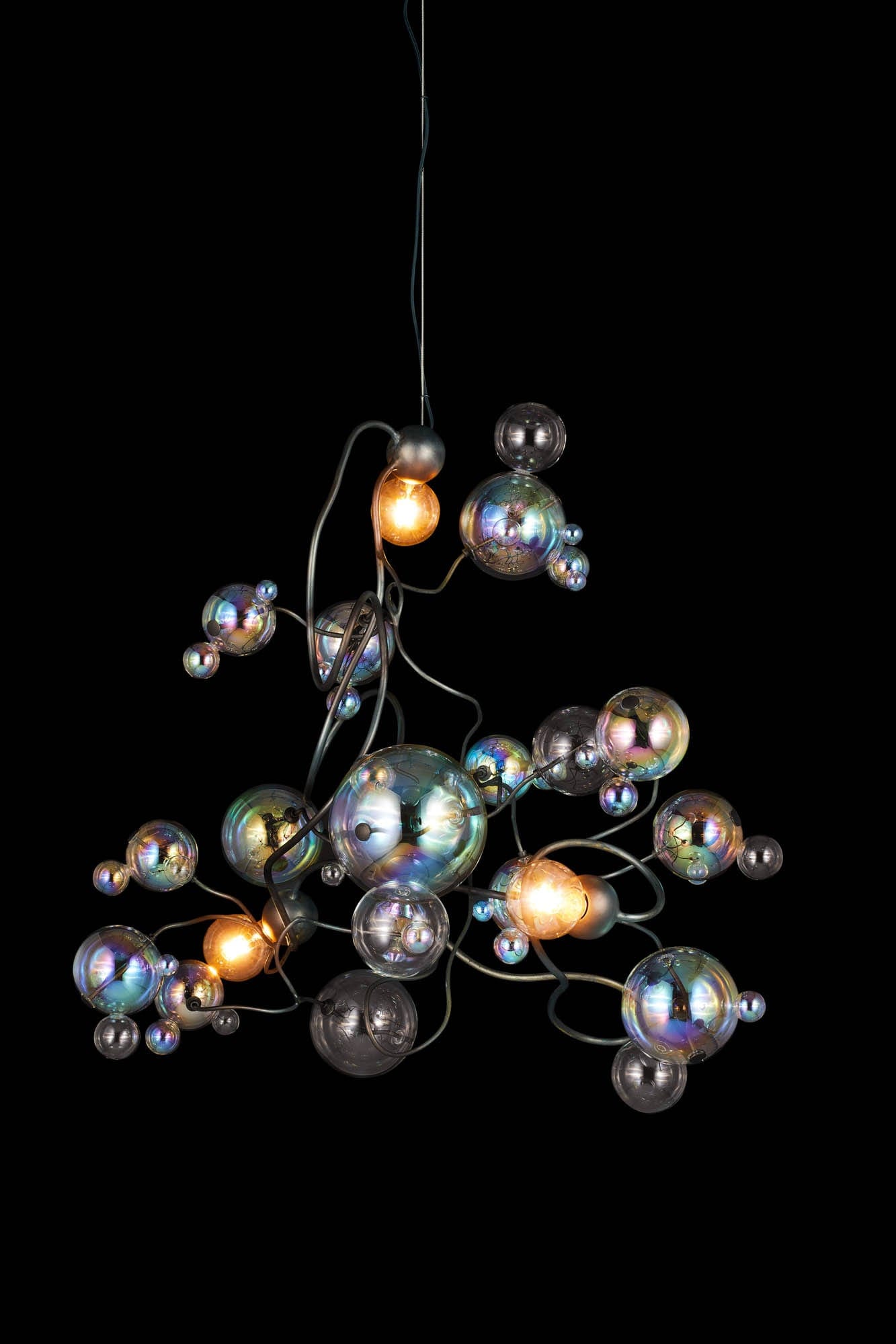 By default, the glass spheres used for the Bubbles Swirl collection are predominantly iridescent, mixed with clear. The standard light bulbs are: globe E27-L for 220-240V | E26-L for 110-120V versions.