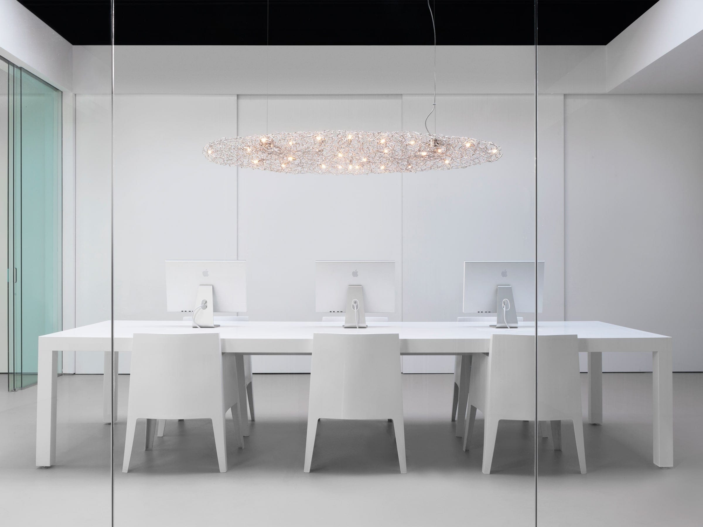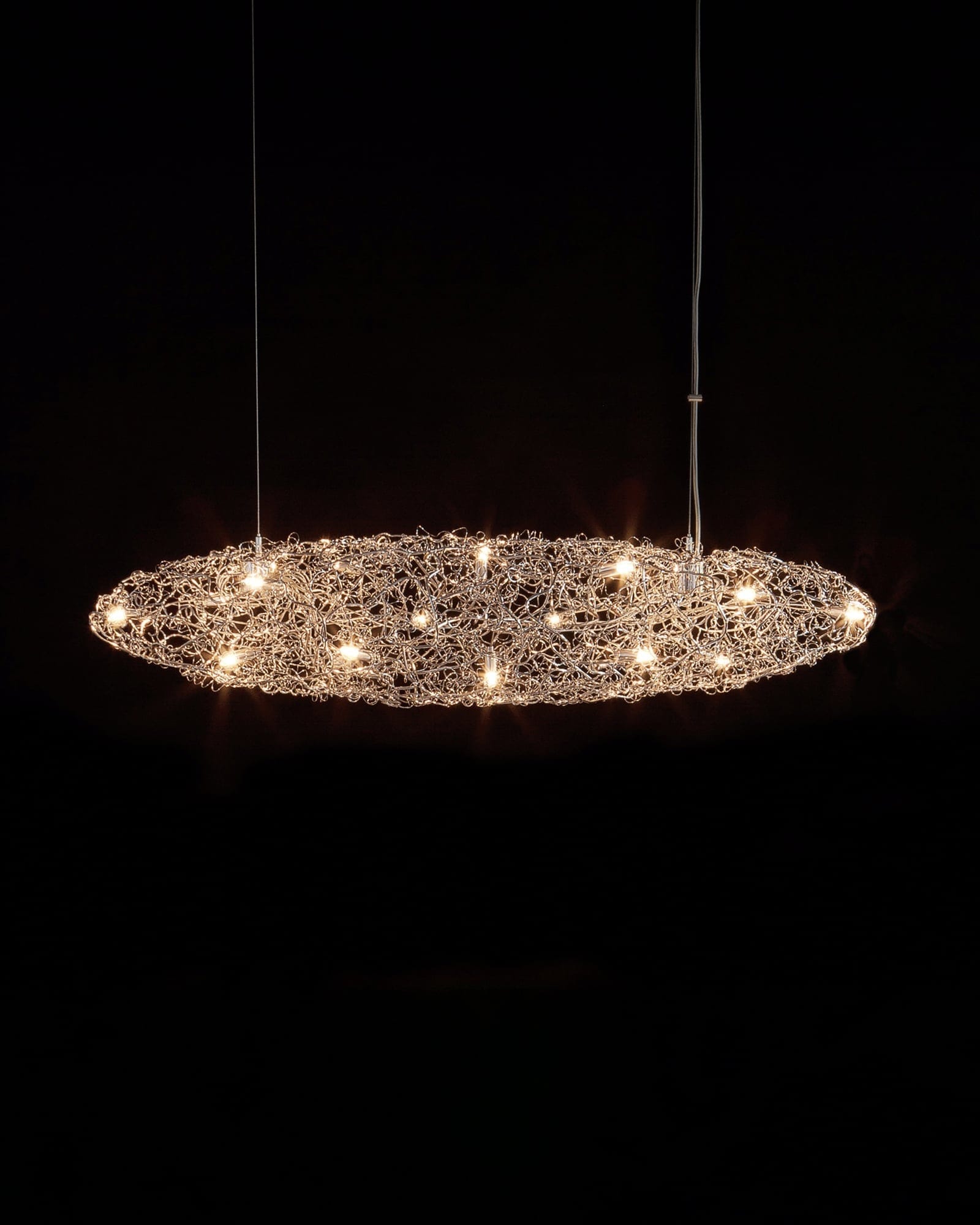All long lamps are supplied with Ø12 cm (4.7 in) and Ø1.6 cm (0.63 in) ceiling covers HL-2, 250 cm (98.4 in) of double steel cable, and 350 cm (137.8 in) of electric cable. The total drop can be easily adjusted on-site.