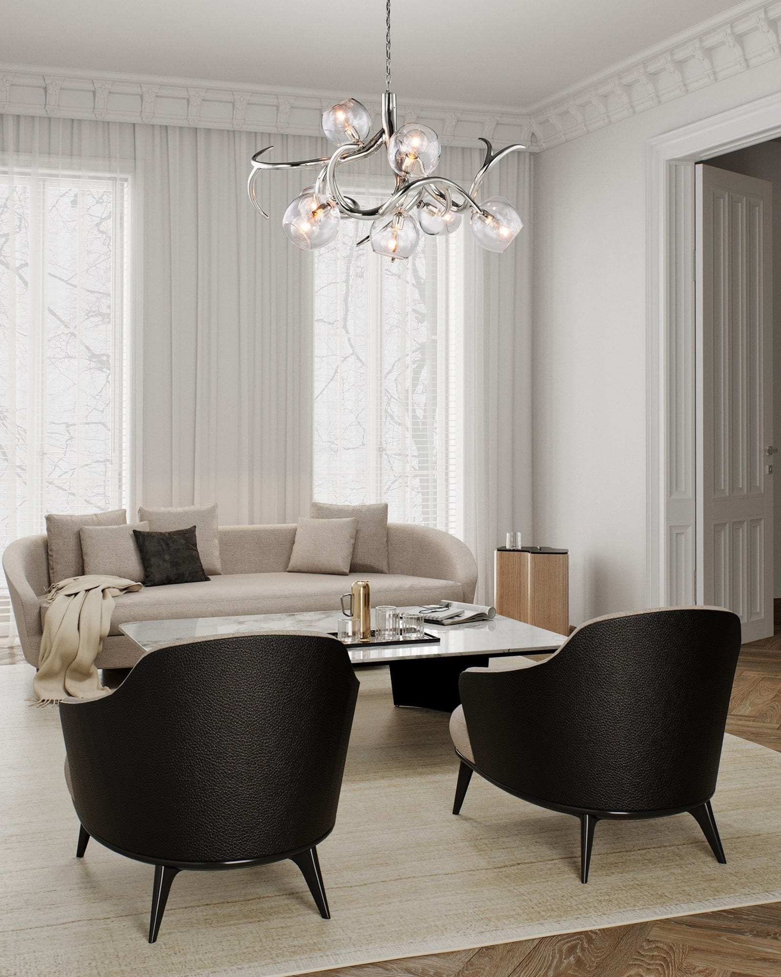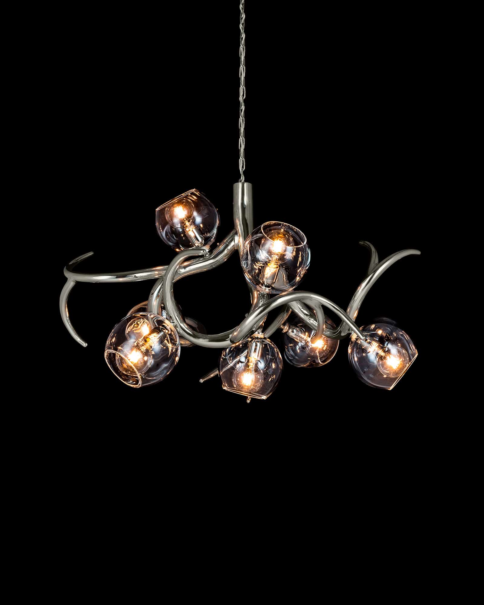 All chandeliers are supplied with a Ø12 cm (4.7 in) dome ceiling cover A-1, Ø16 cm (6.3 in) mounting plate, 170 cm (66.9 in) of chain, and 350 cm (137.8 in) of electrical cable to be woven into the chain. The total drop can be easily adjusted on-site.