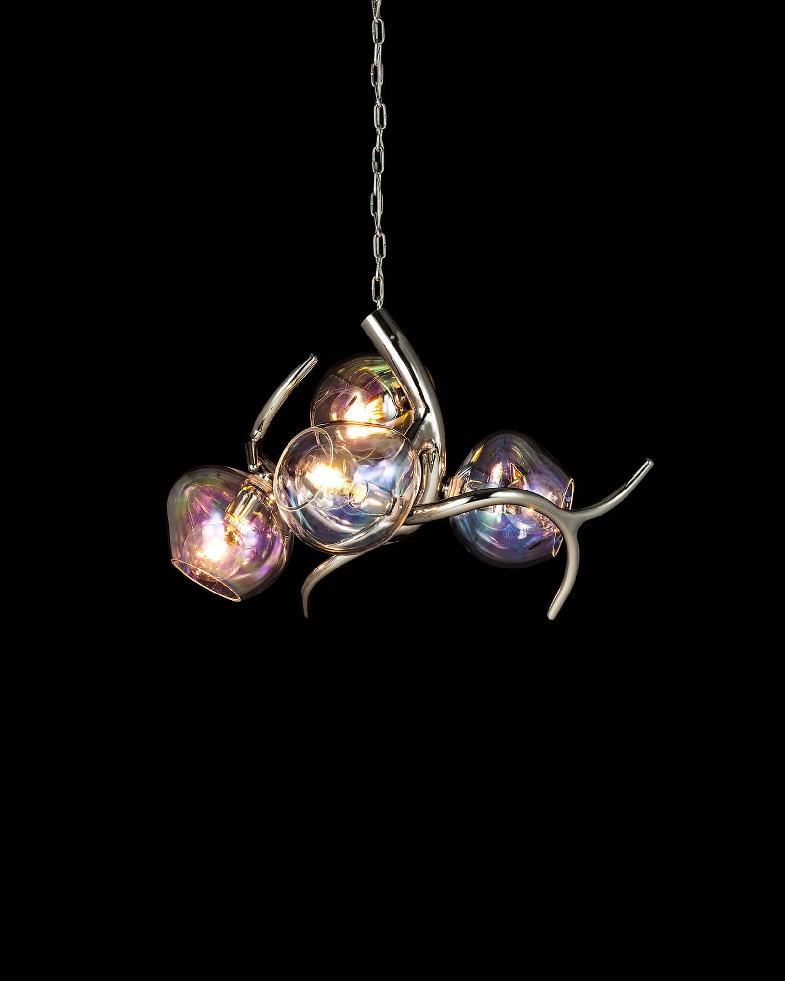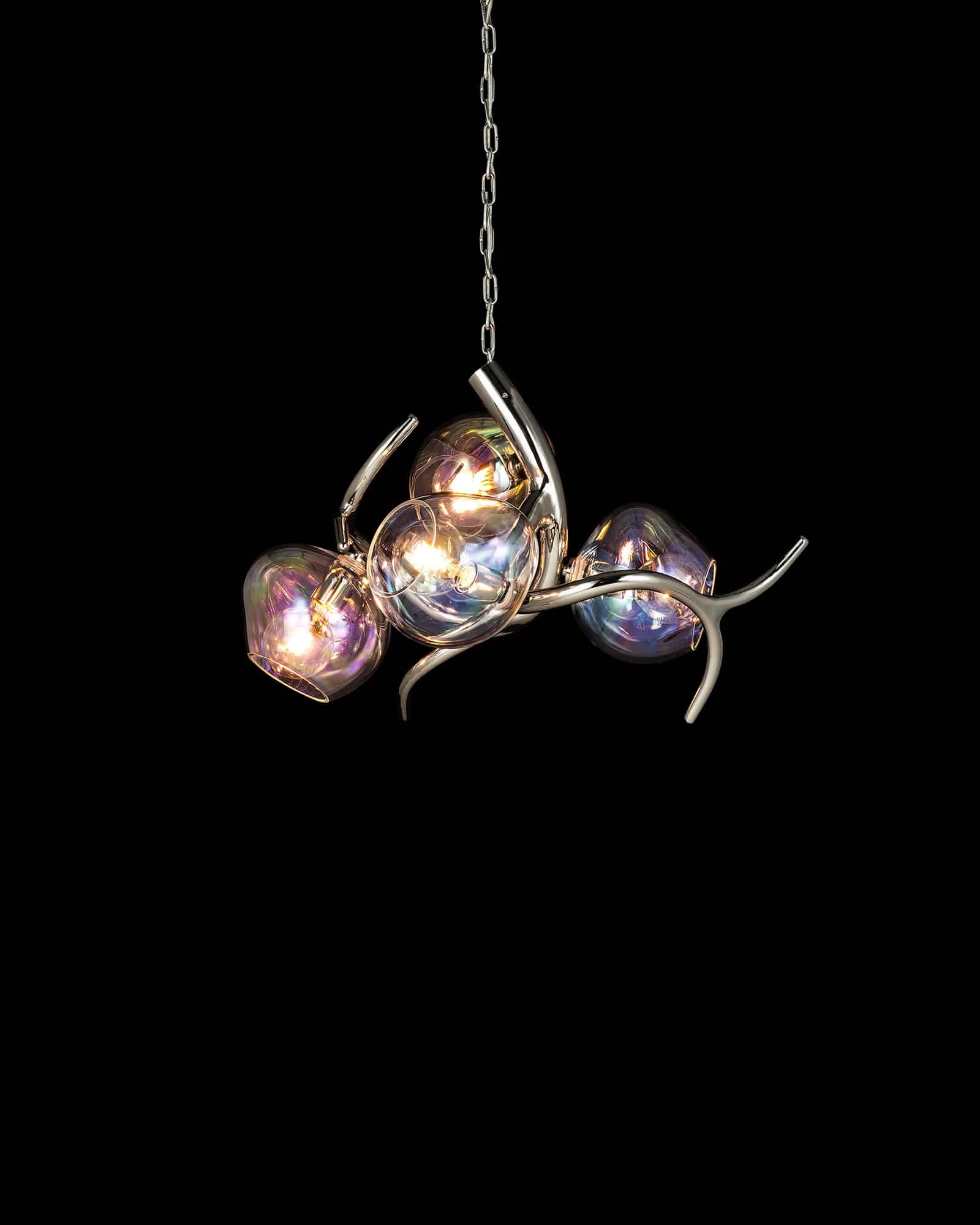 | ERSAC80NAW-GLIRI | Ø80xH.55 cm | 5x E27 | 15 kg | nickel aged warm - glass sphere iridescent | |