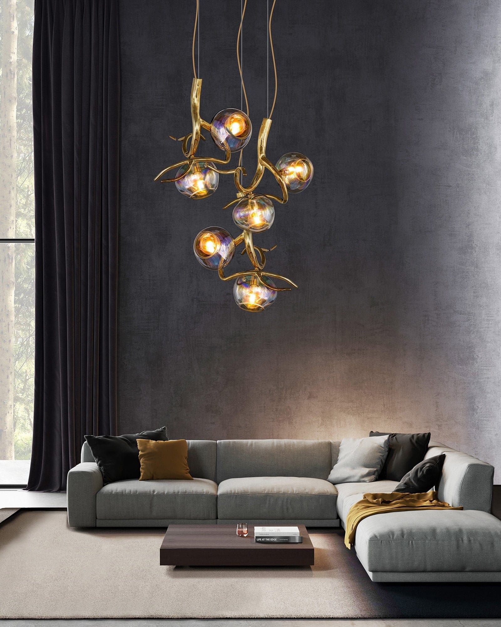 As standard, the Ersa is supplied with iridescent glass spheres. Other options are: bronze, translucent, white satin, clear. The standard light bulbs are: globe E27-L for 220-240V | E26-L for 110-120V versions.