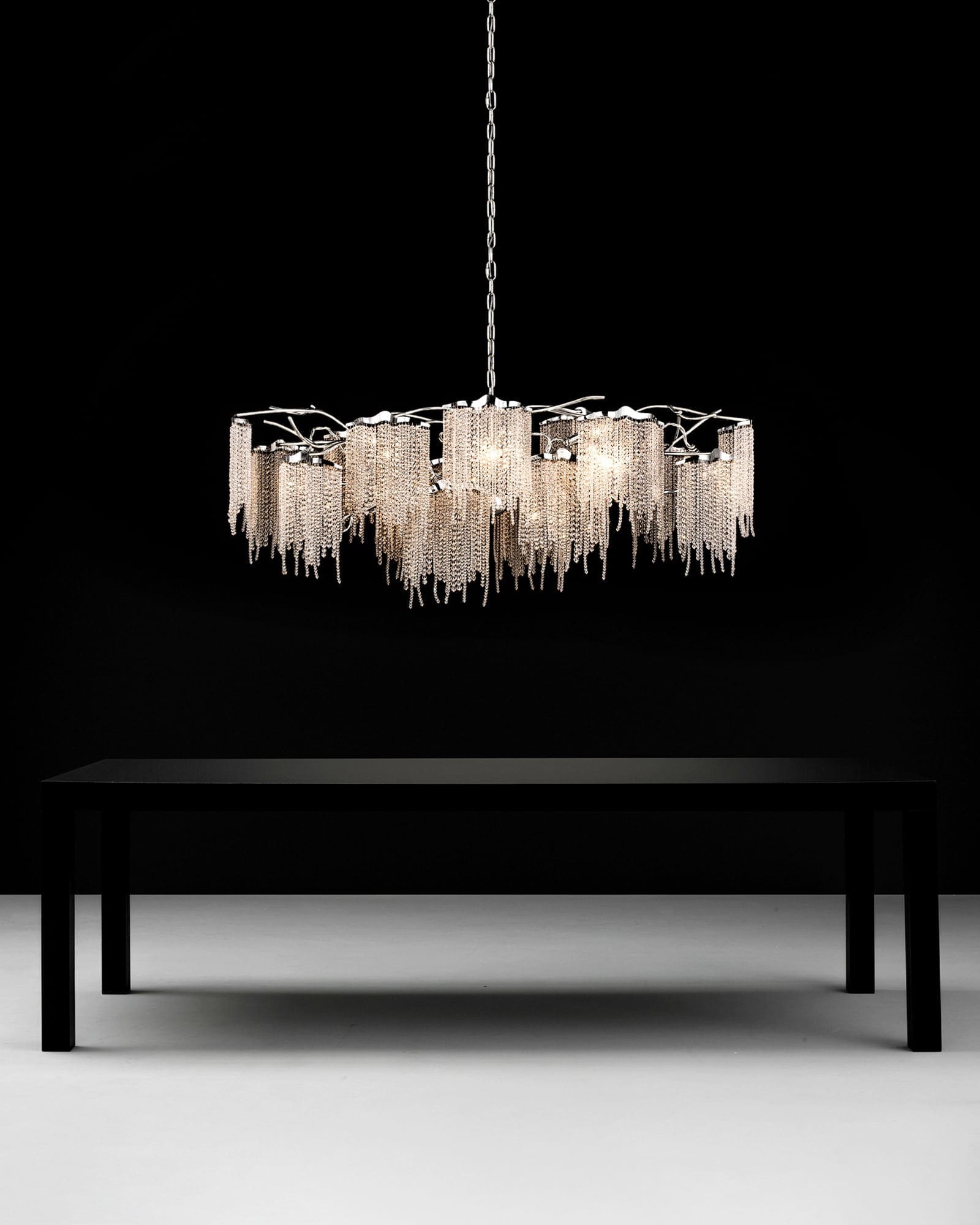 All chandeliers are supplied with a Ø12 cm (4.7 in) diameter dome ceiling cover, Ø16 cm (6.3 in) mounting plate, 170 cm (66.9 in) of chain, and 350 cm (137.8 in) of electrical cable to be woven into the chain. The total drop can be easily adjusted on-site.