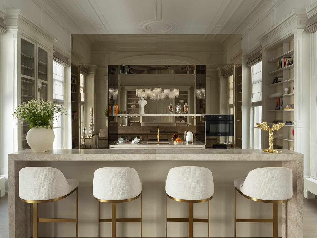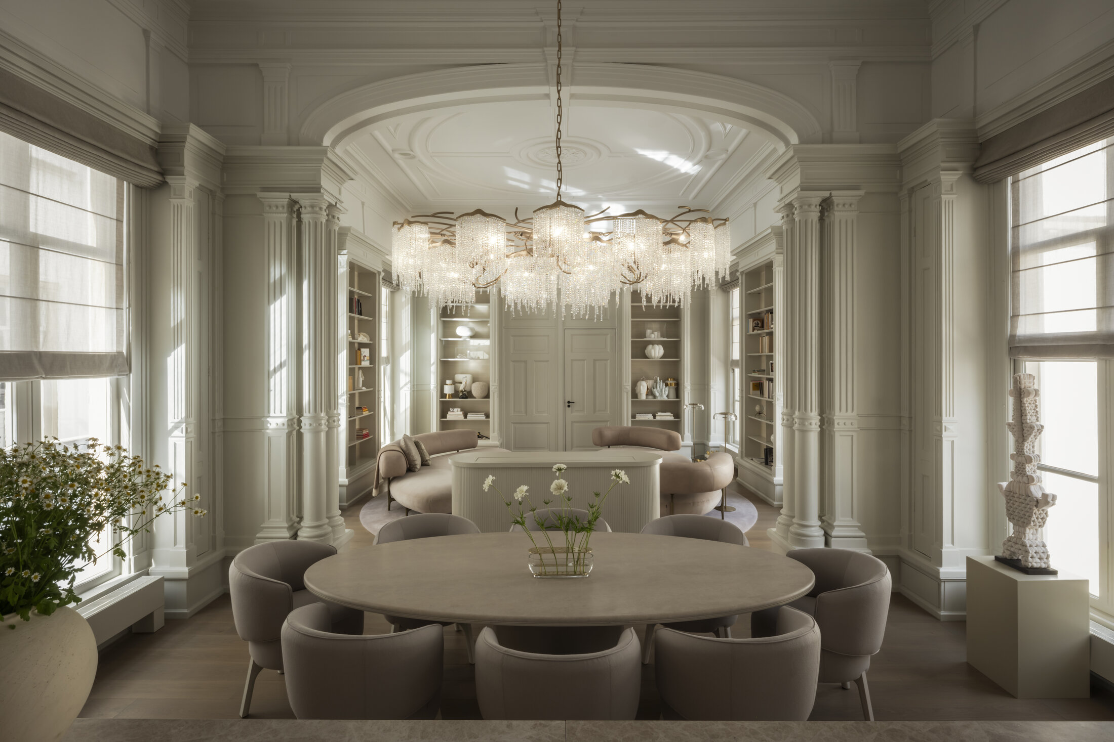 In the Library Suite, our Victoria Oval Chandelier and matching Victoria Wall Lamps were conceived to resonate with the suite’s refined interior language. Executed in a warm Gold Satin finish, the lighting introduces a soft, dignified glow that complements the architectural detailing and the tactile richness of the space. Inspired by the optimism and refined elegance of the early twentieth century, the Victoria collection reveals light layer by layer through crystal and form — a quiet sensibility that finds a natural expression in the Library Suite at Rosewood Amsterdam.